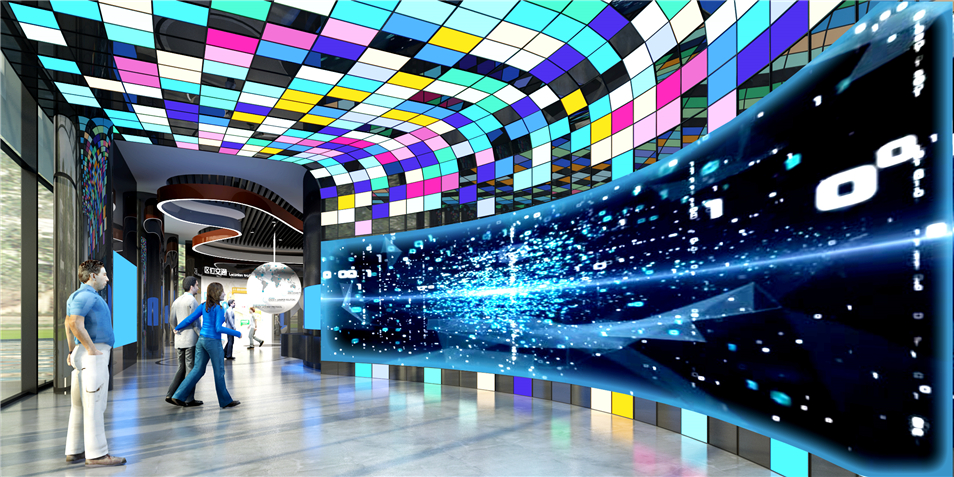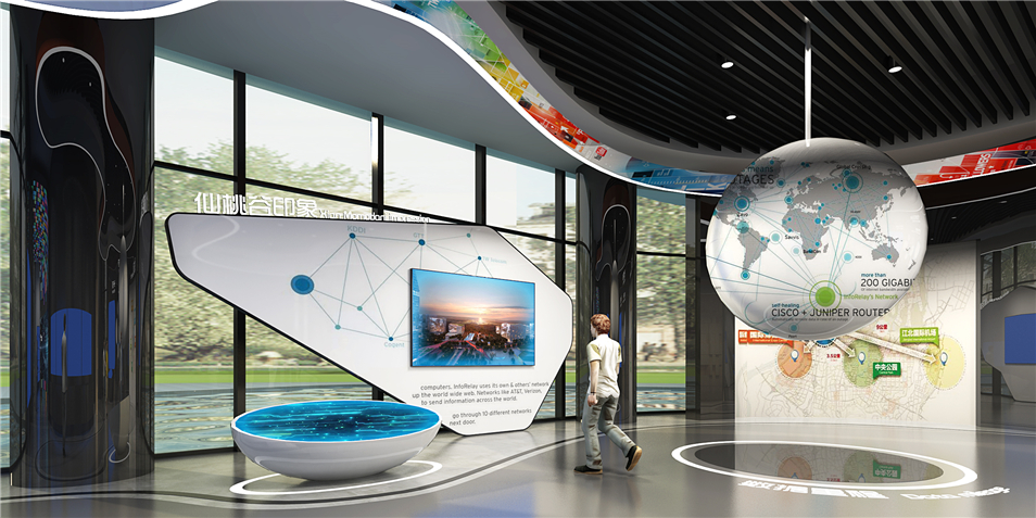 重慶仙桃國際數據谷展示體驗中心,展廳主要布局了序廳、仙桃印象、規劃宏圖、創新平臺、綜合產品體驗區、幻彩走廊、產業洽談推進區、影院共八大主題展區,宣傳數據谷規劃理念和成果,是接待來訪領導、企業、嘉賓的高科技會客廳。
