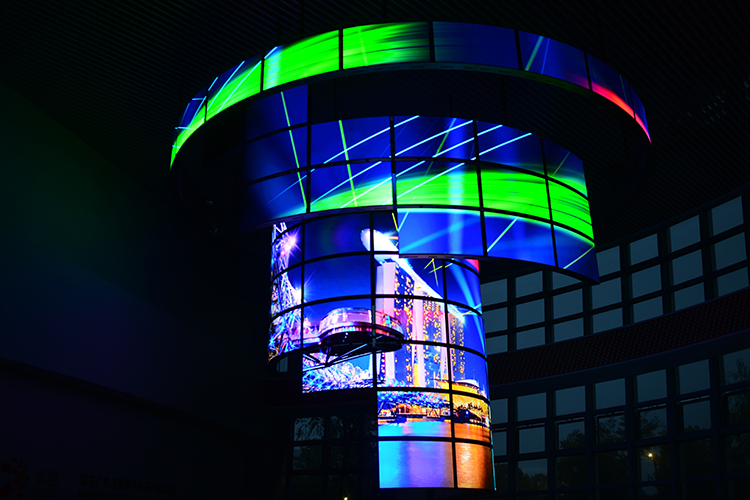 OLED雕塑三層巨幕由內(nèi)而外環(huán)形展開(kāi),66片55EF5C曲面OLED屏拼接的環(huán)形半徑從2米、4米、4.5米依次擴(kuò)大錯(cuò)落有致,視頻畫面在整體巨幕上播放,動(dòng)作、圖像、聲音精確同步,盡顯科技質(zhì)感。