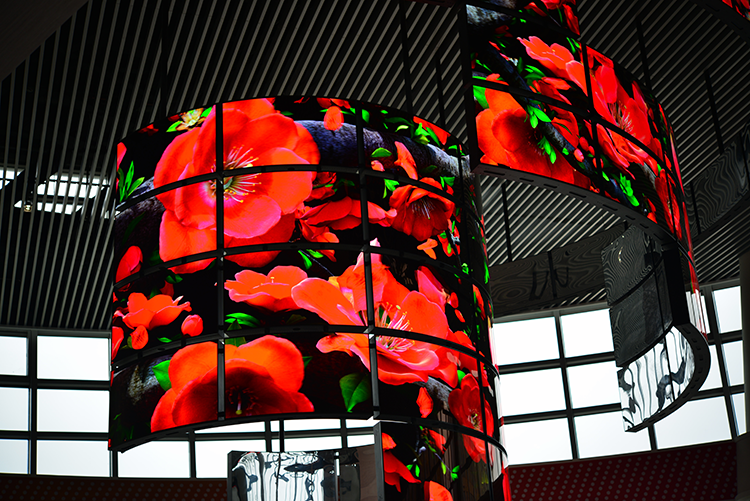觸屏異形顯示屏由12塊55寸屏無(wú)縫拼接,應(yīng)用4:4:4顏色無(wú)損同步顯示技術(shù)及強(qiáng)大的后臺(tái)發(fā)布管理功能,實(shí)現(xiàn)海量4K視頻視頻同步播放。