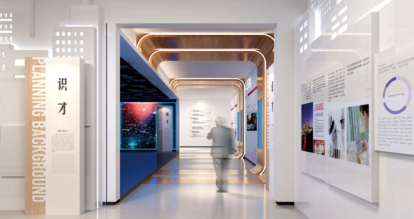 展廳引用習近平總書記十九大報告中“以識才的慧眼、愛才的誠意、用才的膽識、容才的雅量、聚才的良方,把黨內和黨外、國內和國外各方面優秀人才集聚到黨和人民的偉大奮斗中來。”一句話貫穿整個廳;以人才為核心,吸引人才、服務人才、留住人才等角度打造智慧人才展廳。