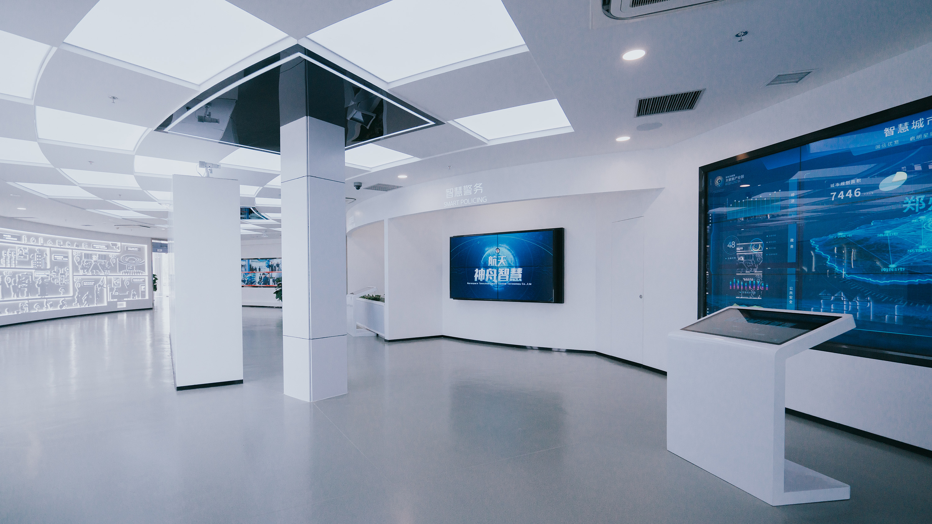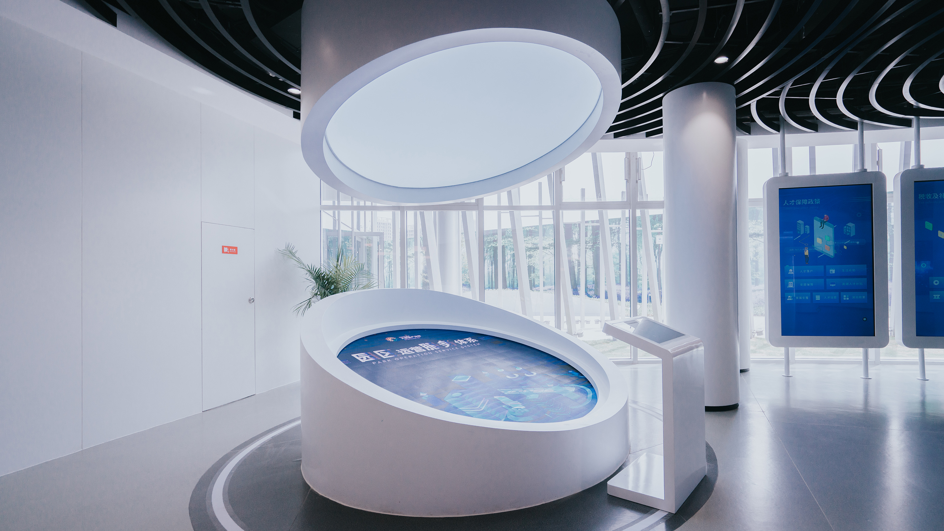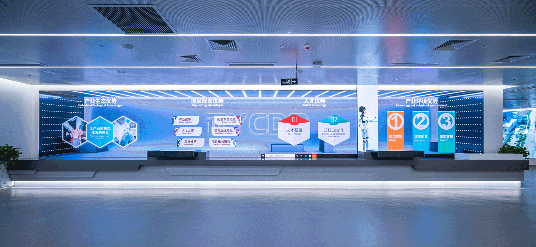 天健湖智聯網產業園展示中心分為產業高新、產業宏圖、產業融合、數據宏圖等板塊,配套有路演廳、會議室等共享空間。