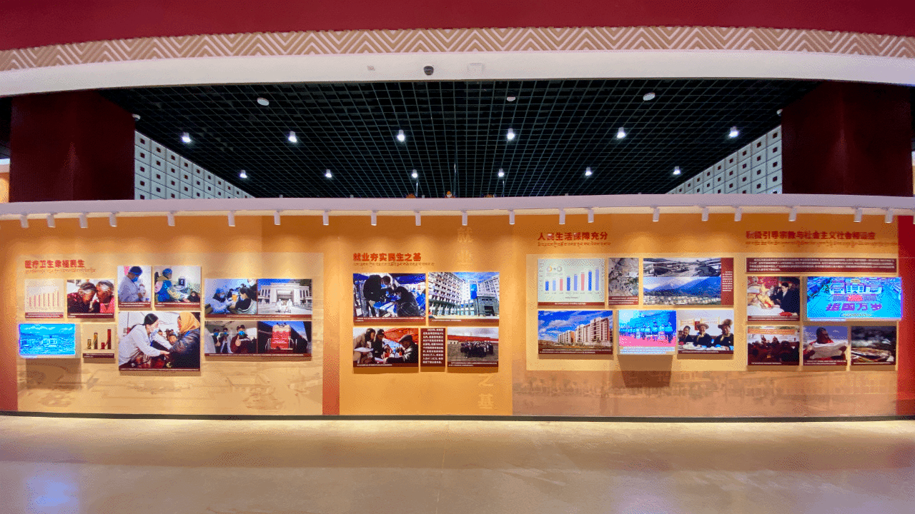經(jīng)過7個(gè)晝夜的緊張?jiān)O(shè)計(jì)和施工,西藏和平解放70周年成就展順利開幕! 8月18日下午,全國(guó)政協(xié)主席汪洋率中央代表團(tuán)全體成員來到西藏博物館,為《黨的光輝照邊疆 錦繡高原譜華章——西藏和平解放70周年成就展》開館揭幕、發(fā)表致辭,帶隊(duì)參觀了成就展并予以高度評(píng)價(jià)! 《黨的光輝照邊疆 錦繡高原譜華章——西藏和平解放70周年成就展》由“偉大歷程”和“輝煌成就”兩個(gè)部分組成。展覽全面回顧西藏和平解放、民主改革、自治區(qū)成立、社會(huì)主義建設(shè)、改革開放、進(jìn)入新時(shí)代的歷史進(jìn)程,全景展示在中國(guó)共產(chǎn)黨堅(jiān)強(qiáng)領(lǐng)導(dǎo)下西藏經(jīng)濟(jì)社會(huì)發(fā)展取得的偉大成就。 《十七條協(xié)議》簽字儀式歷史照片、實(shí)行民族區(qū)域自治制度的展板、對(duì)口援藏資金圖表、《西藏自治區(qū)民族團(tuán)結(jié)進(jìn)步模范區(qū)創(chuàng)建條例》圖片……一塊塊展板、一張張圖片圖表,生動(dòng)展現(xiàn)了70年來西藏在黨的領(lǐng)導(dǎo)下取得的長(zhǎng)足發(fā)展。 披星戴月,晝夜奮斗,金螳螂文化的設(shè)計(jì)施工團(tuán)隊(duì)見過太陽初升時(shí)的拉薩,也見證著西藏和平解放70周年成就的輝煌。金螳螂文化以匠心出品致敬西藏和平解放70周年,以經(jīng)年累月的專業(yè)和敬業(yè),努力做文化與藝術(shù)的傳播者。 目前,西藏博物館基本陳列——西藏歷史與文化展也正處于緊鑼密鼓的施工階段。金螳螂文化集結(jié)精銳力量,聚力呈現(xiàn)全新的西藏博物館,弘揚(yáng)藏地文化之美。