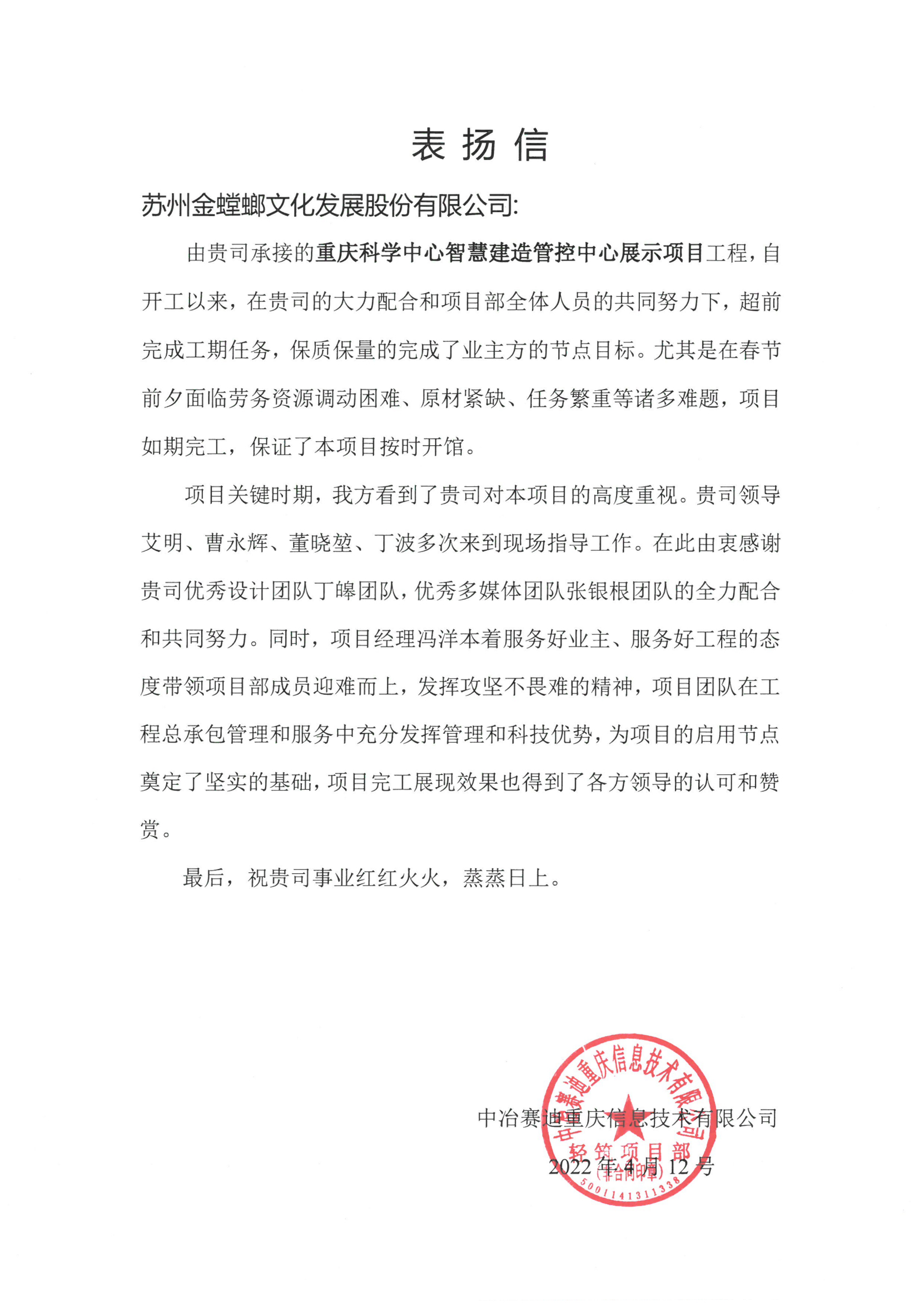 虎峰山下,科技之光閃耀巴渝 中國科學院重慶科學中心 智慧建造管控中心展廳 金螳螂文化出品 Smart Construction Control Center? (視頻) 中國科學院重慶科學中心由重慶市政府與中國科學院共同打造,聚焦大數據智能化、生物醫學、新材料、生態環境等研究攻關方向,規劃建設硅基光技術研究院、生物醫學數據科學研究中心等專業研究機構。 4月上旬,重慶市副市長熊雪調研智慧建造管控中心 由金螳螂文化設計打造的重慶中科院智慧建造管控中心展廳分為企業廳、項目廳、共享廳三個展廳,從“展、控、演、感”四個方面詮釋中科院文化、中冶賽迪歷史軸線以及項目的數字化設計、施工、運維、多區域化管控等內容。 項目建設過程中,為了更好地展示項目應用的智慧工地、綠色施工、前沿技術等創新亮點,金螳螂文化項目團隊從空間布局、項目展示、交互體驗等方面著手,結合建設單位中冶賽迪智慧建造、綠色低碳等前沿創新技術,打造項目必備的靈魂展示窗口。 中國科學院重慶科學中心將以大科學裝置和一流科技院所為依托,薈萃頂尖科技人才,打造世界知名的科學中心、人才匯聚的創新高地,點燃科技創新的火把,“照亮”科學之城的光明未來。 業主單位中冶賽迪向金螳螂文化發來表揚信 金螳螂文化持續深耕主題展示領域,以匠心打造重慶中科院智慧建造管控中心展廳,愿為科技之發展助力。