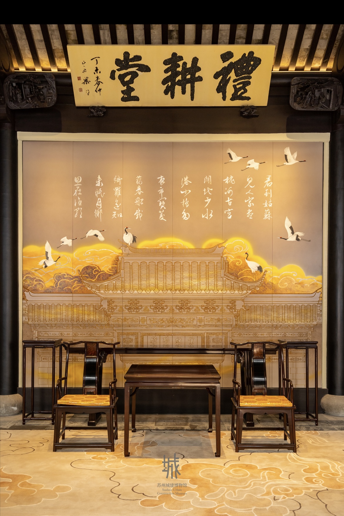 中堂設(shè)計(jì)以潘宅磚雕門頭為原型,借用唐代杜荀詩(shī)句鶴送人游吳,集字唐寅書法,采用漆畫工藝制作。整個(gè)大廳結(jié)構(gòu)規(guī)整,氣勢(shì)恢宏,為清乾隆時(shí)期具有代表性的建筑作品。一磚一瓦,一草一木,觸手可及三百年的滄桑變換。