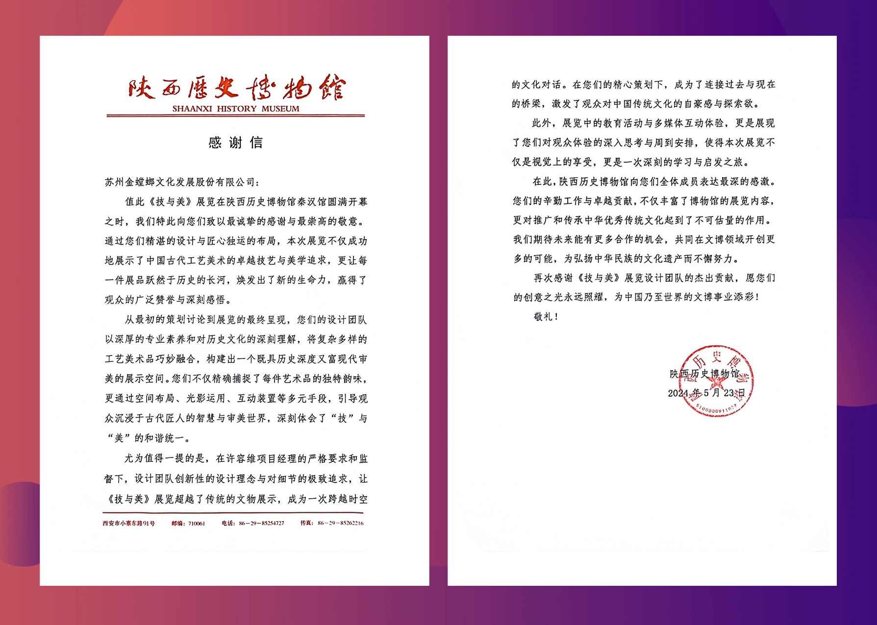 這是一場跨越千年的歷史文化盛宴 這是一場秦漢藝術與技術的探索之旅 陜西歷史博物館秦漢館 “大美中國——秦漢文明專題展:技與美” 邀您來訪揭秘 陜西歷史博物館秦漢館是目前國內唯一一座以集中展示秦漢文明緣起、發展、貢獻為主題的博物館。基本陳列“天下同一——秦漢文明主題展”與“大美中國——秦漢文明專題展”共同構成彰顯秦漢文明偉大成就系列展覽的一軸兩翼。 “城與陵”和“技與美”兩個專題展既是對秦漢文明主題展的呼應,又分別從考古與藝術兩個方面展示秦漢文明的燦爛輝煌。 在三秦大地,金螳螂文化與陜西歷史博物館共同開啟了一場跨越千年的秦漢藝術與技術之旅。 金螳螂文化承擔了館內基本陳列序廳以及“技與美”專題展的設計實施工作,匠心獨運,使展品煥發出新的生命力。展覽贏得了觀眾的廣泛贊譽,得到了館方認可并收獲了感謝信。 “技與美”展廳,分為五色中華、鋒毫輝映、舞影曲落、爐中余香4個部分,共展出文物300余件。 與以往展覽不同,行走在該展廳可以聽到舒緩的音樂、欣賞到樂舞的優雅姿態、書法的流暢筆觸、繪畫的絢麗色彩、聞到香爐的絲縷香氣,使觀眾在視覺、聽覺、嗅覺、味覺、觸覺五種感官的刺激下開啟一段穿越古代秦漢藝術和技術的精彩旅程。 “技與美”色調以白灰為主,強調內部的光影明暗,目的是讓觀眾了解色彩在秦漢時期不僅是一種視覺效應,更是一種深刻的文化現象。 第一部分“五色中華”展區,通過色彩的運用反映秦漢時期對和諧與美感的追求。 展覽的色彩設計基于秦漢時期的五色系統,用文物身上的“青、赤、黃、白、黑”五種基礎色彩,展現古人對季節輪回、朝代更替的理解,反映色彩所蘊含的五行方位和人生百態的哲學思考。 秦漢時期是中國書法藝術形成的重要階段,“鋒毫輝映”是展覽的第二個部分。該展區用線條展示了書法藝術的流暢與生動,體現了秦漢書法的美學價值。 該展區用“立體”的方式,展示了12枚漢代木簡。 這批木簡屬于西塞邊關文書簡,因征集緣故,出土信息較少,且殘損較多,難以綴合或系聯,以“立體”形式展出可以讓觀眾更加近距離觀察這些木簡上面的文字。 第三單元“舞影曲落”,通過樂舞俑的展示,突出漢代樂舞的優雅風姿和動態美,生動體現秦漢時期的藝術之美,讓觀眾在視覺與聽覺的雙重盛宴中感受到漢代樂舞的藝術魅力。 該展區巧妙融合了多媒體技術,將漢代女性樂舞的優雅形象與現代舞者與觀眾的鏡面形成互動,自觀眾踏入這個展區那一刻起,便開啟了一場跨越時空的交流。 當觀眾走進“爐中余香”展區,一股清淡的草本植物香氣撲面而來。 在該展區的C位玻璃柜內,展示的正是茂陵出土的一級文物“鎏金銀竹節熏爐”,這件精美的熏爐不僅是一件藝術品,也是秦漢時期用香文化的重要見證。 為了讓觀眾對香料有一個感官上的深刻印象,金螳螂文化在該展區設置了“香味體驗”。 由陜西非物質文化遺產大師根據先秦文獻和考古發掘的香料,調配了一款香味,讓觀眾在視覺享受之余,通過氣味這一感官,更加深刻地感受到那個時代的生活氛圍和文化氣息。 這種多維體驗,使觀眾在學習秦漢文化的同時,更在心靈深處體會到了那個時代對美的追求。 秦風漢韻,全景呈現 文化盛宴,蔚為大觀 快來陜西歷史博物館秦漢館打卡吧!